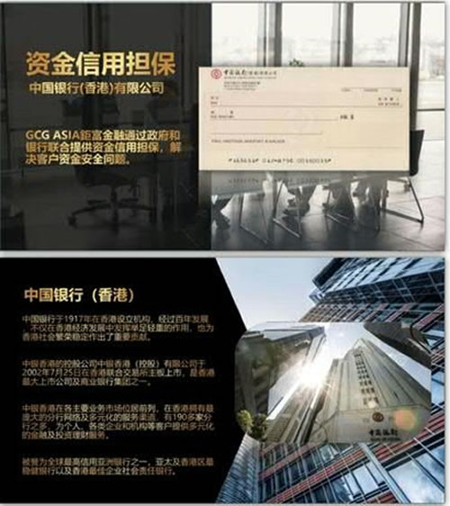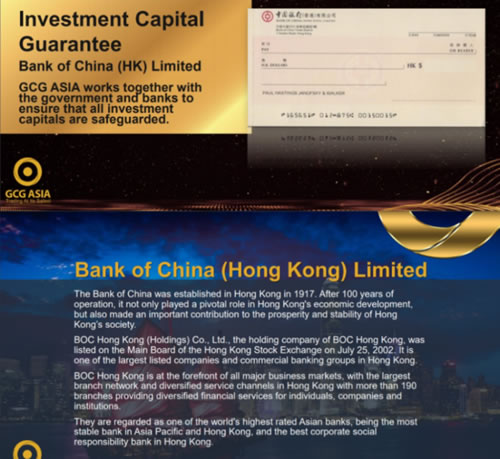 It has come to the attention of Bank of China Limited ("BOC") that GCG ASIA has falsely claimed through various channels that Bank of China (Hong Kong) Limited ("BOCHK") provides investment capital guarantee for GCG ASIA’s customers, with an image of a BOCHK cheque displayed in its promotional materials. In addition, GCG ASIA stated that an event will be organised in Phnom Penh on 20 May, and that its members could obtain credit guarantee bills from Bank of China Phnom Penh Branch. BOC reiterates that BOCHK does not provide any so-called investment capital guarantee as claimed by GCG ASIA, and reserves all its legal rights to pursue legal action. Customers and the general public are reminded to stay vigilant against false claims and frauds.