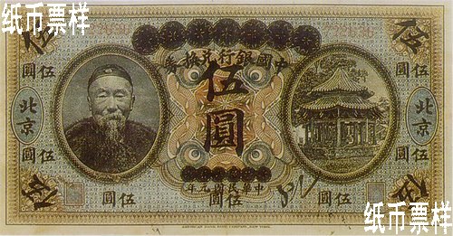 | 李鸿章像兑换券 | 伍圆 | 北京 | 正面左为李鸿章像;右为重檐八角亭图;背面北京颐和园万寿山图 | 蓝、黑 | 94×176 | 美国钞票公司 | 正面为“民国元年”背面为“1 st OCTOBER 1909” |