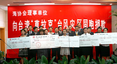 8月12日,海峡两岸关系协会(海协会)在国台办举行“向台湾受灾地区捐赠仪式”。中国银行行长李礼辉出席仪式,并代表中国银行向台湾地区“莫拉克”台风灾区捐赠人民币500万元。