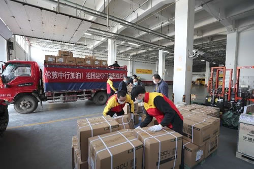第二天,工作小组积极协调防疫物资运输车辆,马不停蹄地取货和海外邮寄。3月19日下午,首批2万只口罩和防护服从郑州发出,预计6天后运抵伦敦。后续物资正陆续寄出。