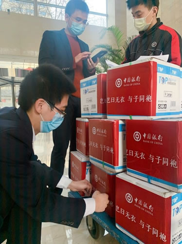 为确保物资安全运抵,分行员工采取多种方式进行投递。大家毫无怨言,卯足干劲,日夜兼程,加紧分装、打包防疫物资寄往海外。防护物资陆续运抵海外国家和地区的消息不断传来,大家感到了极大鼓舞和慰藉。