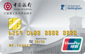 中银宁波诺丁汉认同卡是宁波诺丁汉大学和中国银行联合推出的一张校园联名卡,卡面是诺丁汉大学的标志性建筑---钟楼,右上角是诺丁汉的LOGO,该卡仅面向诺丁汉大学师生(包括已毕业学生)发行。诺丁汉认同卡是磁条和芯片双介质卡,功能强大,不仅具有小额支付、借贷合一、分期付款等基本金融功能,有众多可享受的增值服务,更有为诺丁汉师生量身定制的特色权益。
