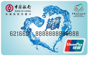 “长城-扶贫月捐”联名卡是中国银行与中国扶贫基金会合作发行的以“扶贫月捐”为主题的借记卡产品。它倡导“全民公益”的理念,通过公众主动、持续、小额地参与公益慈善事业,帮助贫困的弱势群体实现脱贫致富、自强不息,从而营造平等友爱、融洽和睦的社会环境。