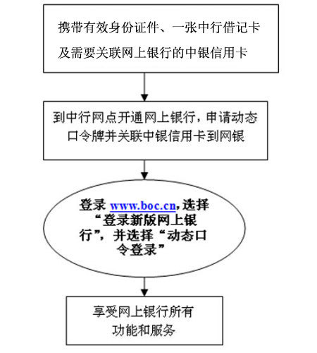 您可在中国银行门户网站www.boc.cn在线开通,也可直接到中国银行营业网点申请网上银行功能。营业网点申请和使用流程如下: