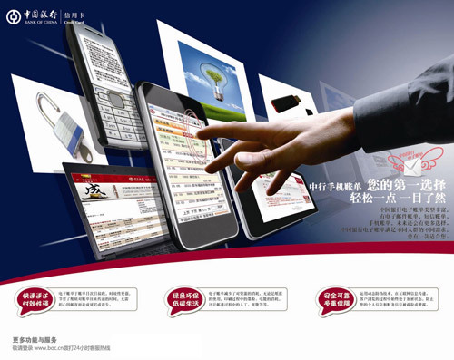 中国银行信用卡手机账单,是国内一种创新服务模式,信用卡账单与资讯促销信息将能及时、安全地发送到持卡客户移动手机上,让持卡人无论处在在何时何地,都能轻松方便阅读中国银行的明细账单和资讯信息。