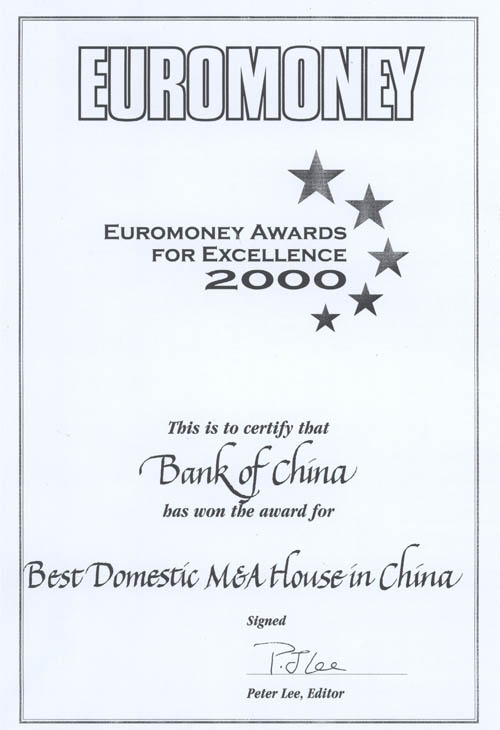 《歐洲貨幣》頒布發給我行2000年度“中國最佳并購機構”證書