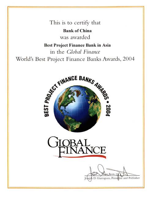 2004年環球金融Global Finance10月刊公布中國銀行獲得“亞洲最佳項目融資銀行(Best Project Finance Bank-Asia)”。