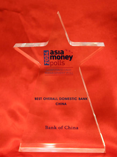 2004年亞洲貨幣AsiaMoney6月刊公布中國銀行獲得“中國最佳現金管理銀行(Preferred Local Cash Management Banks - No. 1 in China)”。