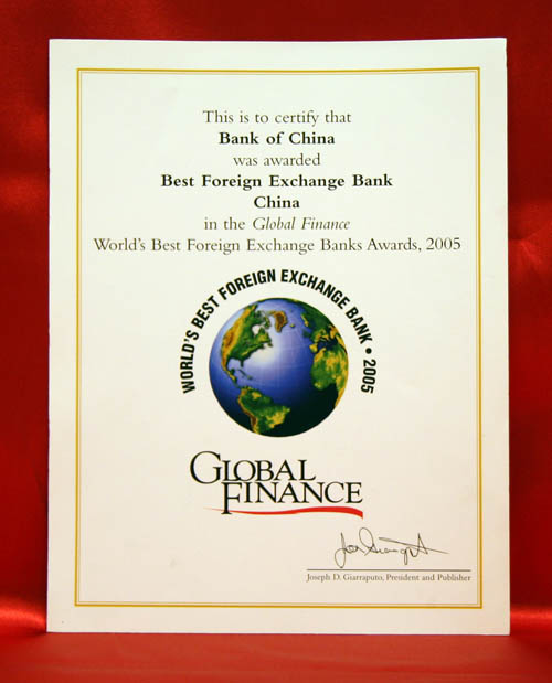 2005年環球金融Global Finance1月刊公布中國銀行獲得“中國最佳外匯銀行(Best Foreign Exchange Bank-China)”。