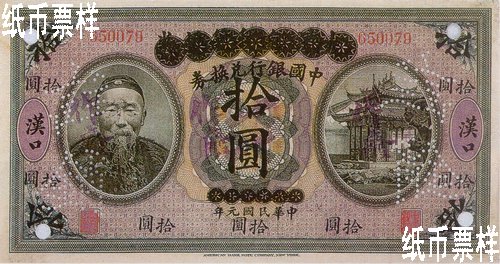 | 李鴻章像兌換券 | 拾圓 | 漢口 | 正面左為李鴻章像;右為四角碑亭圖;背面北京正陽門甕城圖 | 紫、黑 | 100×169 | 美國鈔票公司 | 正面為“民國元年”背面為“1 st OCTOBER 1909” |