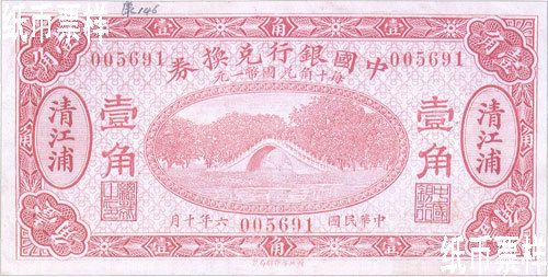 | 國幣輔幣兌換券 | 壹角 | 清江浦 | 正面為北京玉帶橋圖;背面為花紋圖案 | 58×113 | 財政部印刷局 | 正面為“民國六年十月”背面為“OCTOBER 1 st 1917” |