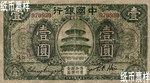 | 各地地名國幣券 | 壹圓 | 江蘇 | 正面為天壇祈年殿圖;背面為花紋圖案 | 正面為橄色,背面為黑色 | 83×149 | 美國鈔票公司 | 正面為“民國七年”背面為“SEPTEMBER 1918” |
