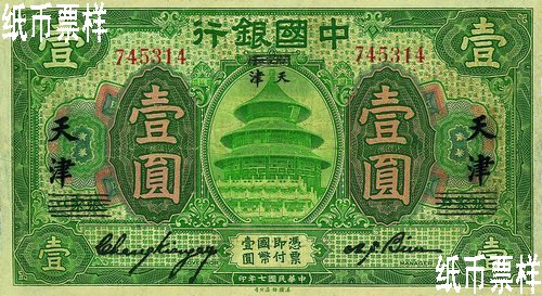 | 各地地名國幣券 | 壹圓 | 天津/張家口 | 正面為天壇祈年殿圖;背面為花紋圖案 | 正面為綠色,背面為綠色 | 83×149 | 美國鈔票公司 | 正面為“民國七年”背面為“SEPTEMBER 1918” |