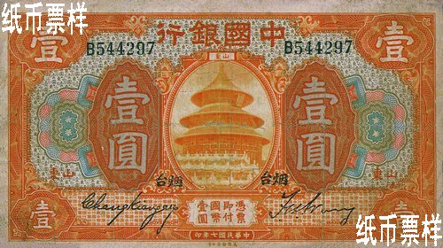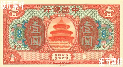 | 各地地名國幣券 | 壹圓 | 山東 | 正面為天壇祈年殿圖;背面為花紋圖案 | 正面為桔色,背面為桔色 | 83×149 | 美國鈔票公司 | 正面為“民國七年”背面為“SEPTEMBER 1918” |