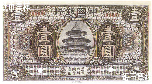 | 各地地名國幣券 | 壹圓 | 上海/北京 | 正面為天壇祈年殿圖;背面為花紋圖案 | 正面為黑色,背面為黑色 | 83×149 | 美國鈔票公司 | 正面為“民國七年”背面為“SEPTEMBER 1918” |