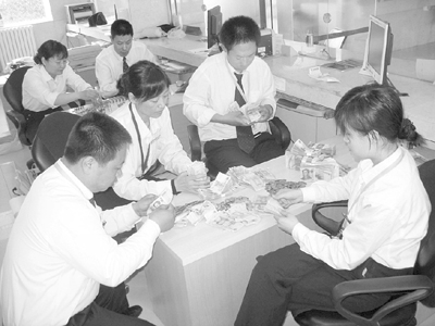 中行河北省滄州市東風路支行員工正在加班清點來自社會各界的抗震救災捐款