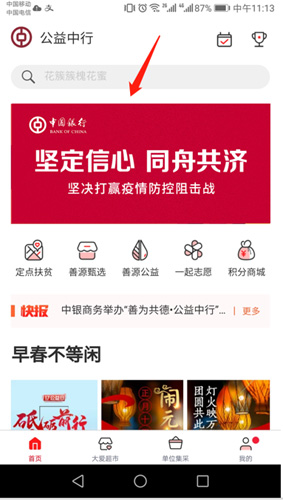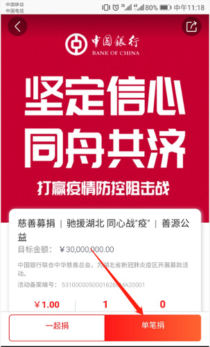 登錄“公益中國”APP——選擇中國銀行“堅定信心,同舟共濟”圖片,點擊進入活動頁面——選擇“單筆捐”進入支付頁面——輸入金額,選擇支付方式——完成支付。