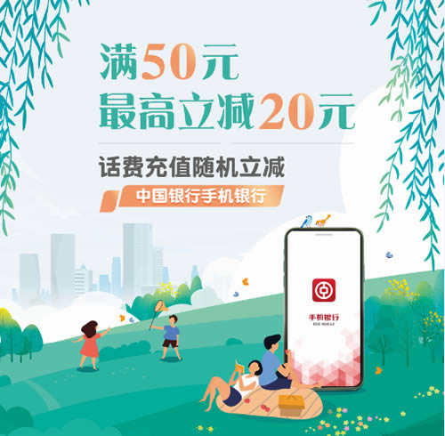 活動期間,中國銀行客戶每月登錄手機銀行APP首次進行話費充值交易(點擊頁底【生活】頻道,再選擇【話費充值】模塊給手機號碼充值),單筆滿50元或以上金額即可享受最高20元隨機立減優惠。