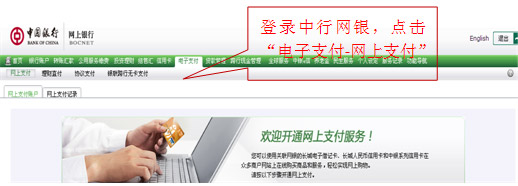1、登錄中行網銀,點擊“電子支付-網上支付”選項。