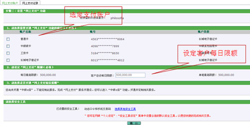 3、在您的網上銀行關聯賬戶中選定網銀支付賬戶,您可在銀行最大限額下設定客戶每日限額(您網上支付的交易限額還與商戶支持的卡類型及限額有關,具體請參見商戶公告或頁面提示)。