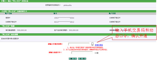 4、輸入手機交易碼和動態口令完成網上支付服務的開通。如您持有二代USBKey,可將USBKey插入電腦完成交易簽名與服務開通。