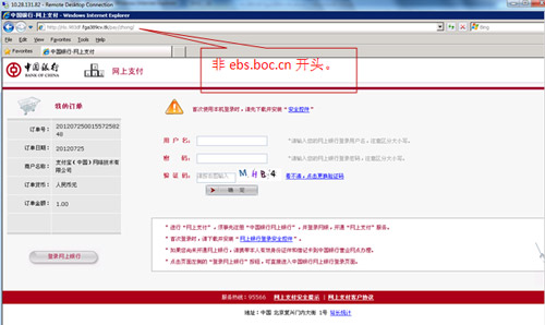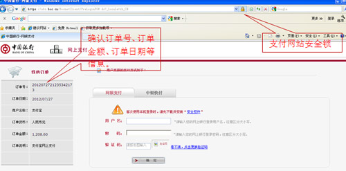 2、請仔細核對訂單號、訂單日期、訂單金額等關鍵信息,查驗登錄頁瀏覽器地址欄后是否有“安全鎖”標志。核對無誤后再登錄中國銀行網上銀行進行支付。