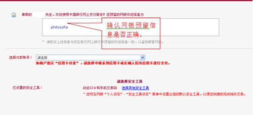 3、登錄中國銀行網上銀行,請首先確認“預留信息”是否正確,再選擇付款賬號進行支付。
