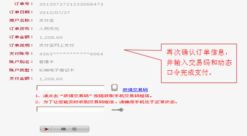 4、請再次核對訂單信息,核對無誤后再輸入手機交易碼和動態口令完成交易。如您持有二代USBKey,可將USBKey插入電腦完成交易簽名。