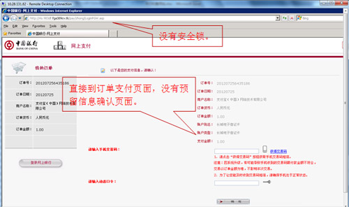 伎倆2:假網站要求客戶同時輸入用戶名、密碼、驗證碼,并以種種花樣要求客戶輸入手機交易碼和動態口令。騙子的目的是騙取客戶網銀密碼信息后,登錄客戶網上銀行竊取客戶資金。某假網站的截圖如下,其破綻在于三處:一是IE地址欄不是以https://ebs.boc.cn/開頭;二是IE瀏覽器看不到證書安全掛鎖;三是支付頁面沒有客戶預留信息;四是中行發送的手機交易碼信息附帶有交易內容,請務必確認相關交易信息與您當前支付信息一致。