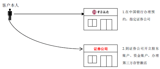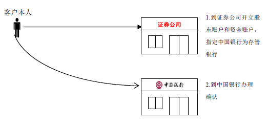 第一步:請您攜帶本人有效身份證件/機構客戶攜帶法人營業執照以及法人組織機構代碼證原件及復印件等相關證明文件,到證券公司開立股東賬戶和證券資金賬戶,之后指定中國銀行為存管銀行(“預指定”)。