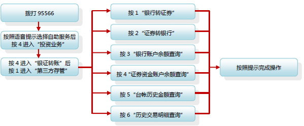 ·銀證轉賬:為您提供本人借記卡/單位銀行結算賬戶與證券資金賬戶之間資金的實時劃轉,您可通過我們的網上銀行、手機銀行、電話銀行、自助終端以及證券公司的交易渠道輕松辦理轉賬。
