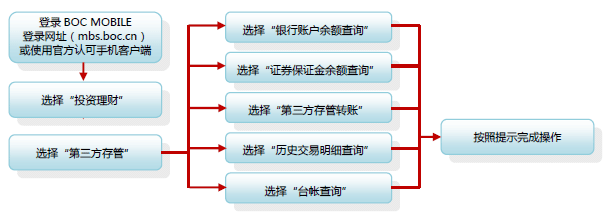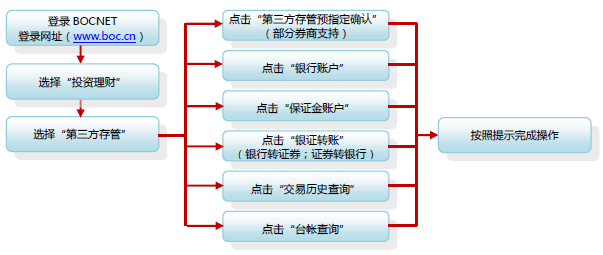 您攜帶本人有效身份證件,到證券公司開立股東賬戶和證券資金賬戶后,可當場辦理開通中國銀行第三方存管服務手續,在證券公司簽署第三方存管服務協議書,無須再到我行營業網點。開通時需向證券公司提供您的中行借記卡號,個人客戶需由您親自輸入電話銀行密碼進行身份驗證。