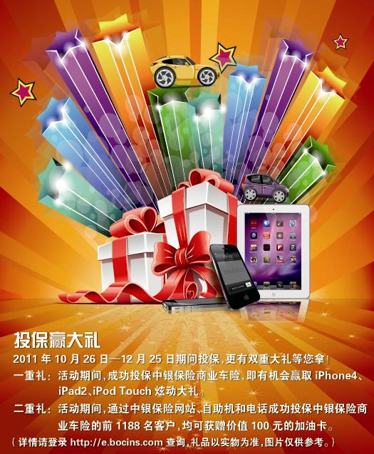 一重礼:成功投保中银保险电销商业车险,即有机会赢取iPhone4、iPad2、iPod Touch炫动大礼。按客户成功投保的保单数量计算(成功投保须完成保费的支付),每张保单有一次抽奖机会,但每名投保人仅有一次中奖机会。