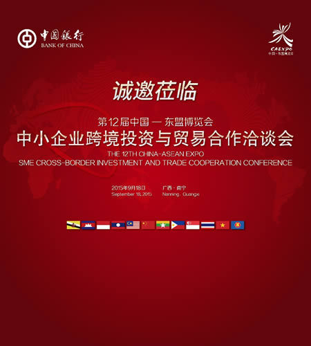 中国银行联合广西壮族自治区人民政府主办的“第12届中国-东盟博览会中小企业跨境投资与贸易合作洽谈会”,将于2015年9月18日在广西南宁盛大召开。
