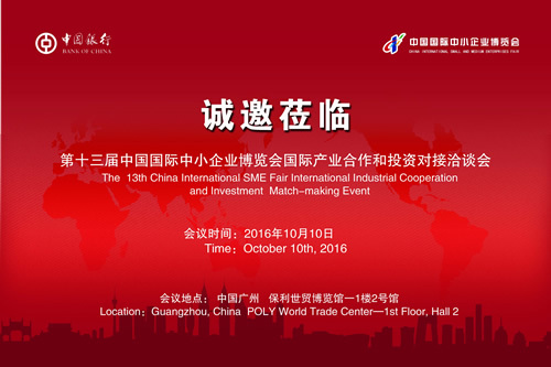 第十三届中国国际中小企业博览会(简称:中博会)国际产业合作与投资对接洽谈会将于10月10日(中博会首日)在广州保利世贸博览馆1楼2号馆举行,会场设100个对接洽谈桌,拟邀600家中外中小企业参加“一对一”、“面对面”的现场洽谈,为有投资或引资需求的中外中小企业提供现场对接服务。