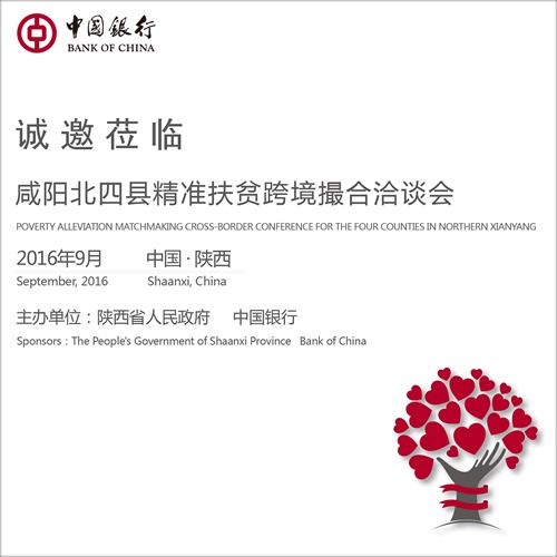 贯彻落实党中央和国务院关于脱贫攻坚的战略部署,落实精准扶贫、精准脱贫的基本方略,陕西省政府与中国银行将于2016年9月21日在陕西咸阳举办“咸阳北四县精准扶贫跨境撮合洽谈会”,积极践行以产业扶贫助推贫困地区脱贫致富。
