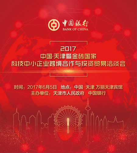 2017年6月5日-6日,中国银行联合天津市人民政府举办“2017年中国∙天津暨金砖国家科技中小企业跨境合作与投资贸易洽谈会”。2017年中国接任金砖国家轮值主席国,此次活动是中国银行作为金砖国家工商理事会成员机构主办的重要活动,旨在借助中国银行国际化、多元化优势,帮助国内中小企业与金砖国家乃至全球中小企业加强交流合作,实现优势互补,互利共赢,共享全球价值链的商机。