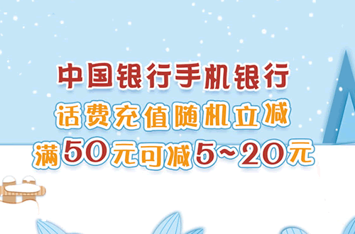 活动期间,中国银行客户每月登录手机银行APP首次充话费(点击页底【生活】频道,再选择【话费充值】模块给手机号码充值),一次满50元或以上金额,即可享受随机立减5—20元不等的优惠。