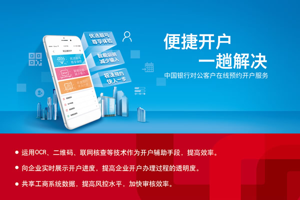 “对公客户在线预约开户”功能是中国银行为广大对公客户提供的一种全新的在线预约开户服务。客户通过H5页面方式在线填写基本信息、选择预约网点、选择靓号和产品即可完成本外币对公账户的开户预约。客户携带相关资料和预约编码临柜面签一次即可完成本外币账户的正式开立。