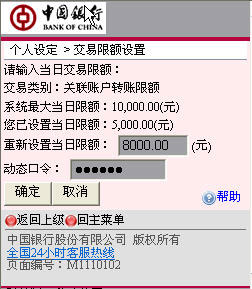 您通过“交易限额设置”设定的限额不能超过中国银行规定的最大交易限额。