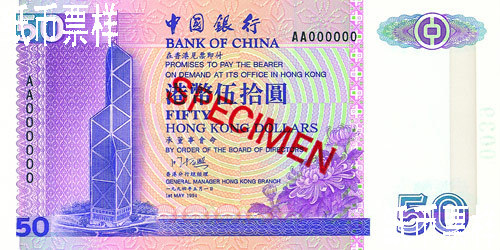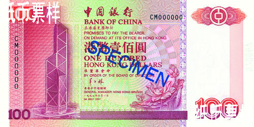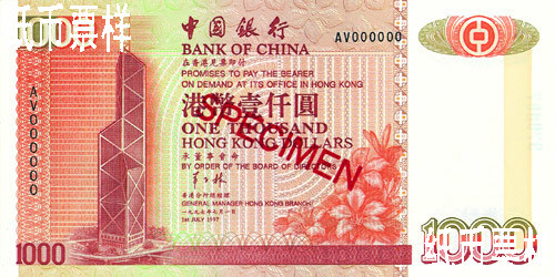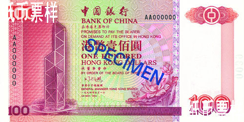 From 1994 to 1999, Bank of China issued Hong Kong notes in HKD 20, 50, 100, 500, and 1,000 printed by Thomas De la Rue (Hong Kong) and Hong Kong Note Printing Limited.