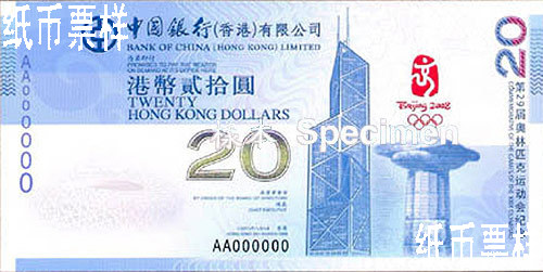 On July 11, 2008, Bank of China (Hong Kong) Limited announced its issuing 4 million pieces of the HKD 20 "Commemorative HKD Banknotes of 2008 Beijing Olympic Games" on the occasion of the coming 2008 Beijing Olympic Games. The design on the front of the note is the column architecture of the cradle of ancient Olympic Games, the emblem of 2008 Beijing Olympic Games and Bank of China Tower in Hong Kong. On the back is the main venue of Beijing Olympic Games – the National Stadium, also known as the Bird's Nest.