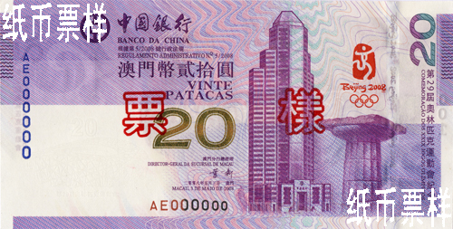 With the approval of the International Olympic Committee and Beijing Organizing Committee for Olympic Games, and under the No. 5/2008 administrative regulation of the Macao S.A.R., Bank of China Macao branch was authorized to issue 4 million pieces of MOP 20 commemorative banknotes for the 29th Olympic Games on 13 July, 2008. The design on the front of the note is the emblem of Beijing Olympic Games, the column architecture of the cradle of ancient Olympic Games and Bank of China Tower in Macao. On the back is the National Stadium, or the Bird's Nest embedded with a traditional Chinese auspicious cloud pattern, a Macau style Lotus pattern and symbolized multicolor sports graphics as well as the image element of 2008 Beijing Olympic Games. The design of the Olympic commemorative notes reflects the concept of "Macao Joining Hands with Olympic Games" for inheritance and promotion of the Olympic Games spirit.