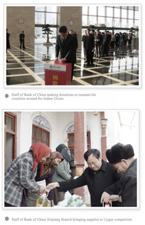 At the end of 2004 when quake and tsunami struck the Indian Ocean, Bank of China launched individual and group donations on a voluntary basis to disaster-stricken countries, with a total amount of RMB 13.49 million. Bank of China Hong Kong Charity Foundation, founded by Bank of China (Hong Kong) Limited, took an active part in calling for donations among local citizens. A fund of HKD 7.02 million was thus raised, of which HKD 4.8 million was from staff of Bank of China (Hong Kong) Limited and the Foundation. These funds were sent to the disaster area through Hong Kong Red Cross.
