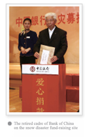 At the beginning of 2008, a rare snow and ice storm attacked many regions in southern China and posed great challenges to local people's life. Bank of China, together with its staff, responded swiftly and donated over RMB 12 million to these regions. In order to help the victims regain their normal life and production, Bank of China opened a "Green Finance Channel", providing financial support for rescue services. Branches in disaster areas overcame various difficulties to ensure normal operation of their outlets, which gained wide appraisal from the society.