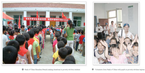 Bank of China has rendered vigorous support to the educational undertakings and the improvement of school management capabilities in poverty-stricken areas. From 1994 to 2001, the Bank had made donations of RMB 7.9 million in cash and materials to the former revolutionary base areas in western Fujian for the construction of 15 Hope Primary Schools and 13 school buildings, which had benefited over 10,000 students. In 2002, the Bank built five Hope Primary Schools with one in each of these places: Yongshou County, Chunhua County, Changwu County, Xunyi County of Shaanxi Province and the Fifth Agricultural Division of Xinjiang Production and Construction Corps. The Bank also supported the construction of "Love Building" in No. 1 Primary School of Chengguan Town in Jinchang City, Gansu Province in 2005. In 2006, the Bank extended its helping hand to a Hope Primary School in Qinghe Town of Xinjiang. In 2007, the Bank took a share in the establishment of Guoshoujiu Financial Hope Primary School in Hong'an County, Hubei Province, with an aggregate donation of 3.5 million.