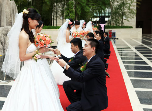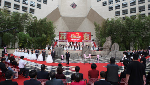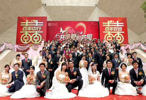 On June 27, 2010, a group wedding ceremony named "drawing a blueprint of love together" was held in the Four Seasons Hall of Bank of China's head office building. Witnessed by Bank of China's leaders and the staff's families and friends, 50 pairs of newlyweds that serve at the front lines of Bank of China's "IT Blueprint" information system project started a new chapter of happy life.