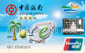 To commemorate the 20th anniversary of the establishment of the special economic zone in Hainan Province, Bank of China issued "I Love Hainan" Credit Card, the first regional affinity credit card in Hainan on April 8, 2008. As a credit card under the international standards, this card offers multiple basic functions and services provided by Bank of China.