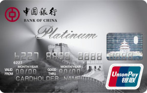 Bank of China Platinum Credit Card is an international standard credit card issued by Bank of China on invitation. Besides global universality, revolving credit, cash advance, free SMS, flexible installment and other functions, Bank of China also provides large credit line up to RMB 2 million, with grace period up to 50 days, double reward points, free VIP lounge services at airports, exclusive golf courtesy, platinum medical healthcare and other president-level services. The various appointed preferential partners and reward point plans may bring customers enjoyment for consumption with the card while Bank of China's overseas branches in more than 20 countries and regions are available for provision of Chinese service.
