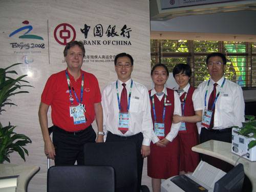 Besides PLV outlets, other BOC temporary outlets at IBC, MPC and Paralympic Family Hotel also made great efforts for the Paralymic Games and have received lots of customers in these days. The considerate and home-like services have been widely acclaimed by athletes, officials and media reporters of the Paralympic Games. Mr. GEORG SCHLACHTENBERGER, Chief Operating Officer of International Paralympic Committee, was very satisfied with the Bank’s service and took photo with the staff (see the following picture).